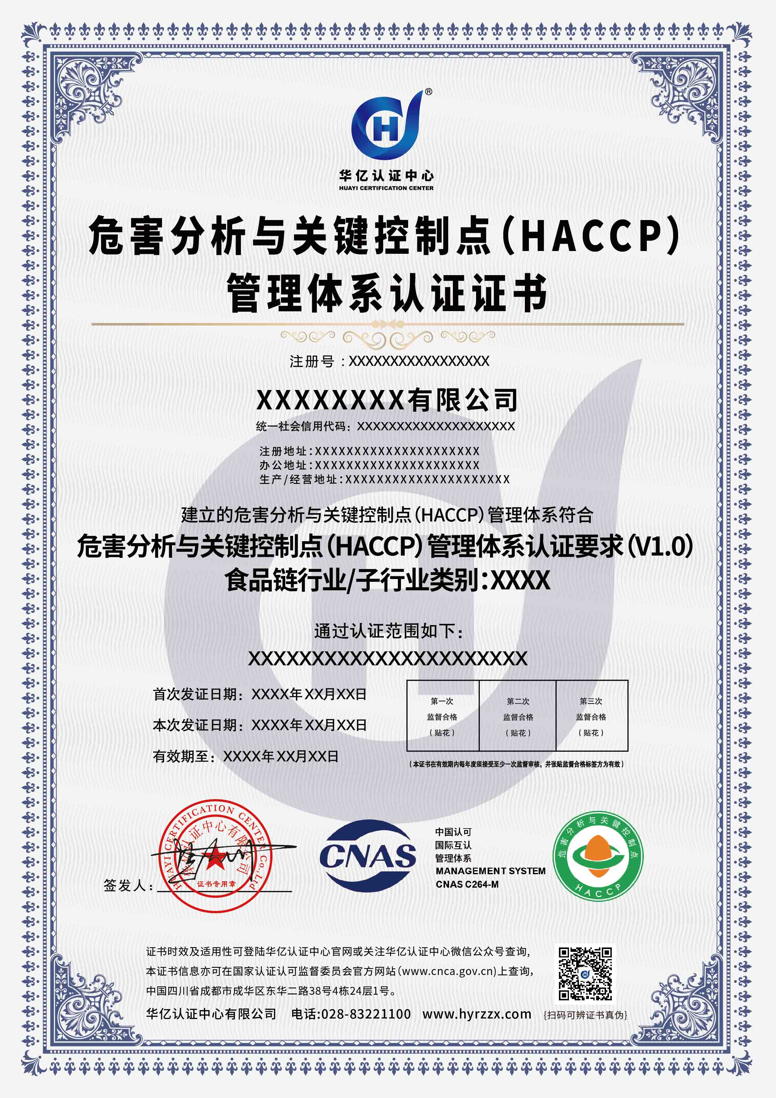 HACCP危害分析与关键控制点认证证书